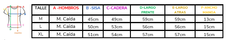 (A la hora de elegir tu talle, debes tener en cuenta que las mismas son tomadas en plano, por lo cual debes multiplicarlas x2 para saber el contorno real y también tener en cuenta la elasticidad de la tela).