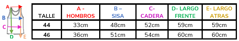 (A la hora de elegir tu talle, debes tener en cuenta que las mismas son tomadas en plano, por lo cual debes multiplicarlas x2 para saber el contorno real y también tener en cuenta la elasticidad de la tela).