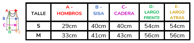 (A la hora de elegir tu talle, debes tener en cuenta que las mismas son tomadas en plano, por lo cual debes multiplicarlas x2 para saber el contorno real y también tener en cuenta la elasticidad de la tela).