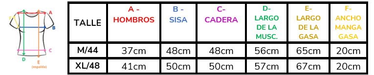 (A la hora de elegir tu talle, debes tener en cuenta que las mismas son tomadas en plano, por lo cual debes multiplicarlas x2 para saber el contorno real y también tener en cuenta la elasticidad de la tela).
