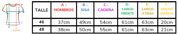 (A la hora de elegir tu talle, debes tener en cuenta que las mismas son tomadas en plano, por lo cual debes multiplicarlas x2 para saber el contorno real y también tener en cuenta la elasticidad de la tela).
