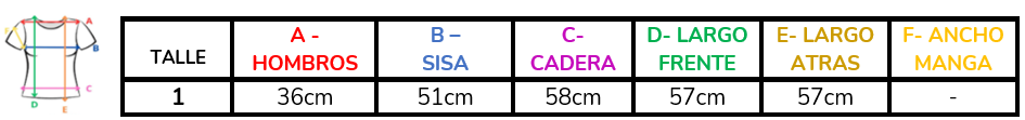 (A la hora de elegir tu talle, debes tener en cuenta que las mismas son tomadas en plano, por lo cual debes multiplicarlas x2 para saber el contorno real y también tener en cuenta la elasticidad de la tela).