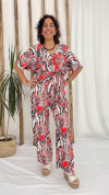 MONO DE LINO ESTAMPADO EN TONOS ROJO, BLANCO Y NEGRO. MANGA CORTA Y LAZO EN LA CINTURA.