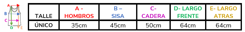 (A la hora de elegir tu talle, debes tener en cuenta que las mismas son tomadas en plano, por lo cual debes multiplicarlas x2 para saber el contorno real y también tener en cuenta la elasticidad de la tela).