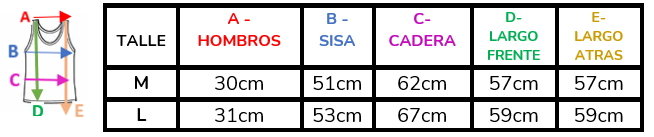 (A la hora de elegir tu talle, debes tener en cuenta que las mismas son tomadas en plano, por lo cual debes multiplicarlas x2 para saber el contorno real y también tener en cuenta la elasticidad de la tela).