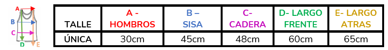(A la hora de elegir tu talle, debes tener en cuenta que las mismas son tomadas en plano, por lo cual debes multiplicarlas x2 para saber el contorno real y también tener en cuenta la elasticidad de la tela).