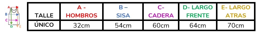(A la hora de elegir tu talle, debes tener en cuenta que las mismas son tomadas en plano, por lo cual debes multiplicarlas x2 para saber el contorno real y también tener en cuenta la elasticidad de la tela).
