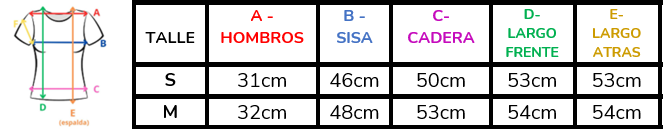 (A la hora de elegir tu talle, debes tener en cuenta que las mismas son tomadas en plano, por lo cual debes multiplicarlas x2 para saber el contorno real y también tener en cuenta la elasticidad de la tela).