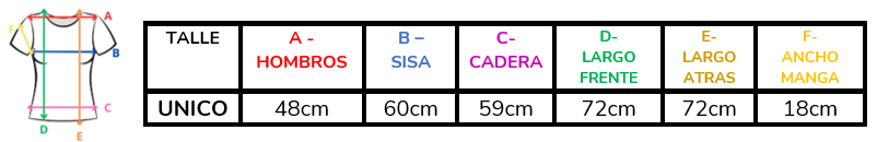 (A la hora de elegir tu talle, debes tener en cuenta que las mismas son tomadas en plano, por lo cual debes multiplicarlas x2 para saber el contorno real y también tener en cuenta la elasticidad de la tela).