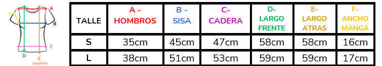 (A la hora de elegir tu talle, debes tener en cuenta que las mismas son tomadas en plano, por lo cual debes multiplicarlas x2 para saber el contorno real y también tener en cuenta la elasticidad de la tela).