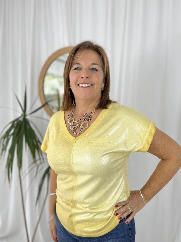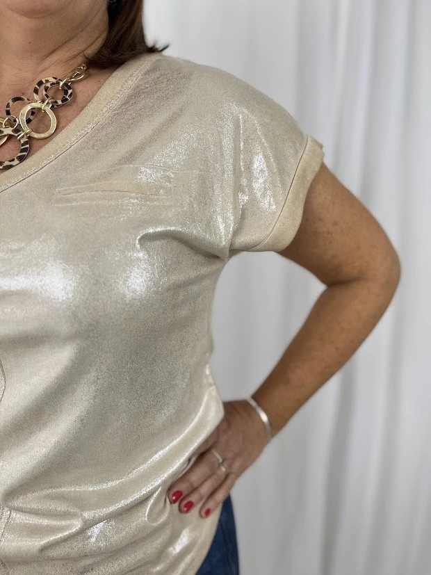 CONFECCIONADA EN VISCOSA ELASTIZADA CON ESCOTE EN V QUE REALZA TU FIGURA. PRESENTA COMO DETALLE UN SIMIL BOLSILLO ADORNADO CON LENTEJUELAS Y EL PESPUNTE DORADO AL FRENTE, LO QUE LE DA UN TOQUE ÚNICO Y GLAMUROSO. ADEMÁS, EN EL FRENTE PRESENTA 2 TEXTURAS DIFERENTES: UNA MITAD ES LAMINADA LO QUE TE HARÁ BRILLAR Y LUCIR FABULOSA.🌼✨ ¡HAZLA PARTE DE TU ESTILO Y MARCA LA DIFERENCIA!🌟👚