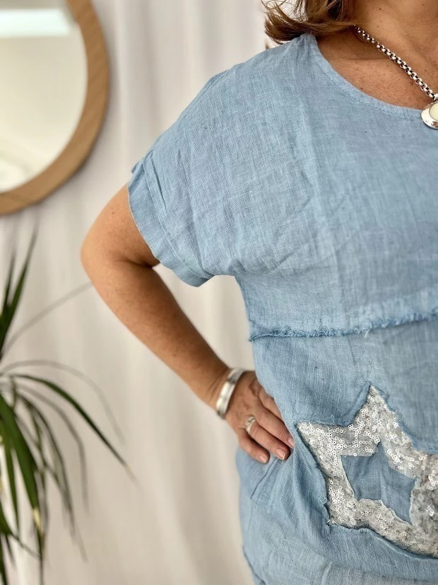 SU ESTRELLA EN LENTEJUELAS LE APORTA UN BRILLO SUTIL Y SOFISTICADO Y SUS COSTURAS RÚSTICAS A LA VISTA LE SUMA UN TOQUE ARTESANAL. PRESENTA MANGA CAÍDA Y UN ESCOTE REDONDO PARA UN ESTILO MODERNO Y FEMENINO. 💃✨IDEAL PARA DESTACAR EN CUALQUIER OCASIÓN.🌸✨