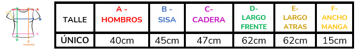 (A la hora de elegir tu talle, debes tener en cuenta que las mismas son tomadas en plano, por lo cual debes multiplicarlas x2 para saber el contorno real y también tener en cuenta la elasticidad de la tela).