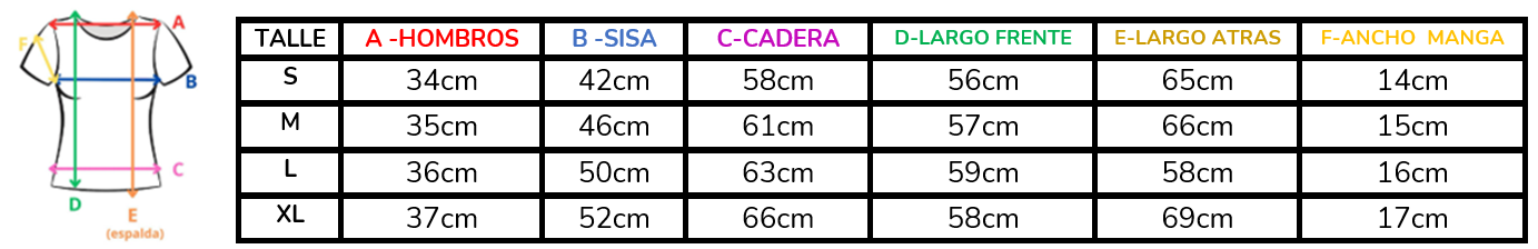 (A la hora de elegir tu talle, debes tener en cuenta que las mismas son tomadas en plano, por lo cual debes multiplicarlas x2 para saber el contorno real y también tener en cuenta la elasticidad de la tela).