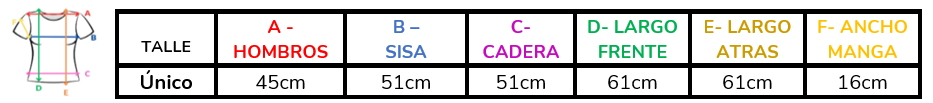 (A la hora de elegir tu talle, debes tener en cuenta que las mismas son tomadas en plano, por lo cual debes multiplicarlas x2 para saber el contorno real y también tener en cuenta la elasticidad de la tela).