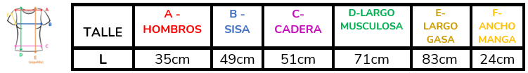 Aclaración: las medidas se corresponden con la musculosa, el saco es ligeramente más amplio.