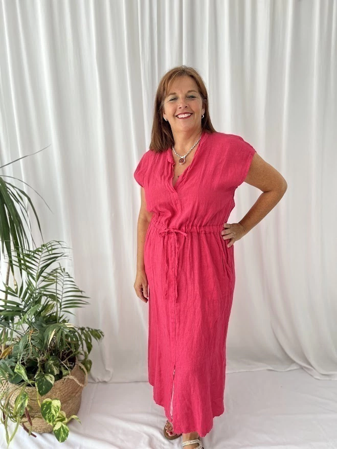 ESTE ENCANTADOR VESTIDO DE LINO CUENTA CON UNA CINTURA AJUSTABLE QUE REALZA TU FIGURA, MIENTRAS QUE SU TAJO EN LA PARTE CENTRAL INFERIOR AÑADE UN TOQUE DE SOFISTICACIÓN. 🙌