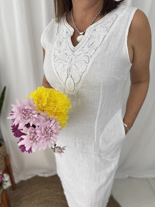🌸✨CAMI ES UN HERMOSO VESTIDO DE LINO BLANCO, CON UN BELLÍSIMO BORDADO EN EL ESCOTE, IDEAL PARA LUCIR RADIANTE Y MEGA ELEGANTE EN TODA OCASIÓN. ESTE VESTIDO VIENE CON BOLSILLOS Y LARGO POR DEBAJO DE LA RODILLA. SU DISEÑO ROMÁNTICO Y FRESCO LO CONVIERTE EN UNA PRENDA ESENCIAL EN TU GUARDARROPA. 😍👚